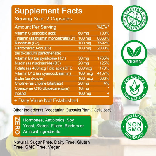 Vitamin B Complex Capsules, Rich in Vitamin B1, B2, B3, B6, Biotin (B7), Folic Acid (B9), B12 Dietary Supplement- 120 Capsules