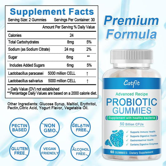 Catfit Probiotic Gummies Daily Immune Support Digestive Gummy 5 Billion CFU Gut Supplement Weight Loss Products for Adult 60pcs